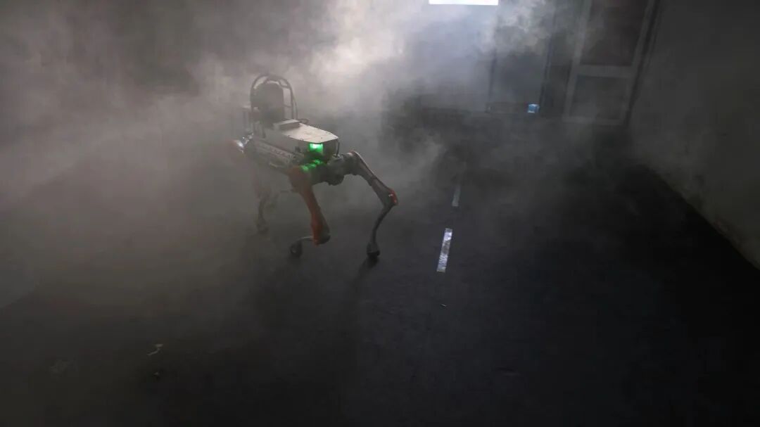 Under the harsh environment of high temperature and thick smoke inside the building, the firefighters of the reconnaissance team wore firefighting intelligent helmets and cooperated with the four-legged robot to carry out internal search and rescue work.