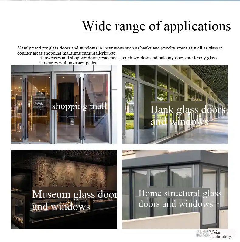 It is mainly used in glass doors and windows of institutions such as banks and jewelry stores, glass display cases and windows in counter areas, shopping malls, museums and galleries, and glass structures in homes where floor-to-ceiling windows and balcony doors are intrusion paths.